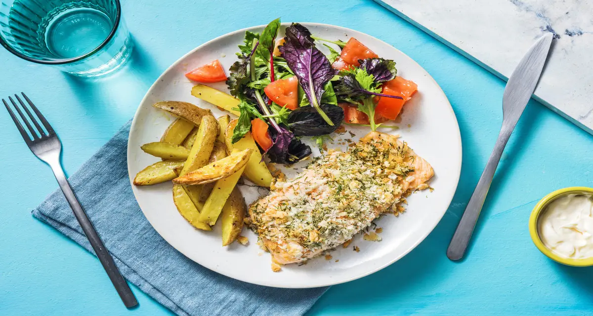 Hvis der er noget, vi holder af her i Norden, er det paneret fisk. Kombinationen af bagt, sprød rasp og fløjlsblød, saftig fisk er ikke til at tage fejl af, og vores panerede laks er ingen undtagelse. Under et sprødt skjold af citron- og dildpanering gemmer sig et stykke mundvandsdrivende laks, der med garanti vil gøre enhver nordbo varm om hjertet. Serveres med rødbede- og pastinakfritter og grøn salat.