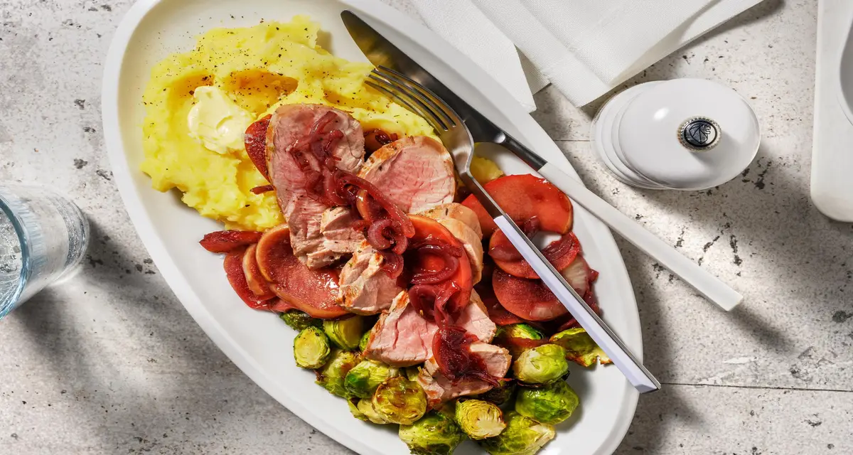 Når det er koldt og mørkt udenfor, er der ikke noget bedre end en varmende og lækker aftensmad. Vi laver svinemørbrad vendt med rosmarin, salvie og sennep, som vi serverer med en cremet kartoffelmos toppet med honningbagte rosenkål og en herlig rødvinssauce med karamelliseret æble og løg.
