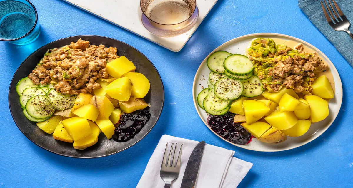 - 6Anret kartofler, gryderet og agurk på tallerkener. Krydr agurk med et nip peber. Server med tyttebærsyltetøj.